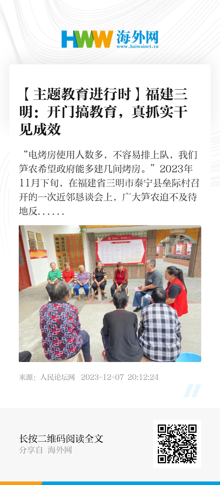走近群众身边,走进群众心间。作为三明市深化“四下基层”制度的重要抓手,在全市乡村、社区召开的近邻恳谈会是三明市落实党中央、福建省委决策部署,坚持“开门搞教育”,推动主题教育在基层一线落地见效的生动缩影。重心向下、脚步下移,真正把“开门搞教育”抓实抓到位,努力让人民群众感受到主题教育带来的新气象、新变化。