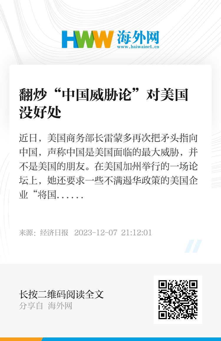近日,美国商务部长雷蒙多再次把矛头指向中国,声称中国是美国面临的最大威胁,并不是美国的朋友。在美国加州举行的一场论坛上,她还要求一些不满遏华政策的美国企业“将国家安全考虑置于短期利润之上”。雷蒙多的言行暴露了美方一些人士根深蒂固的冷战思维和霸权心态,这对美国的国家利益没有任何好处,也无法阻挡中国的繁荣发展。
