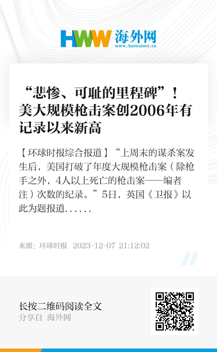 【环球时报综合报道】“上周末的谋杀案发生后,美国打破了年度大规模枪击案(除枪手之外,4人以上死亡的枪击案——编者注)次数的纪录。”5日,英国《卫报》以此为题报道称,今年已成为美国自2006年有记录以来发生大规模枪击案最多的一年。