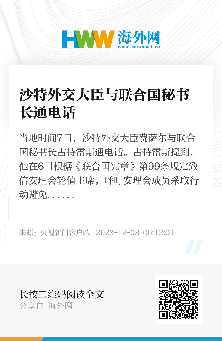 费萨尔表示,沙特对联合国秘书长援引《联合国宪章》第99条表示赞赏和大力支持。双方强调必须做出更多努力以实现巴以之间立即停火。(总台记者 张亚宁)