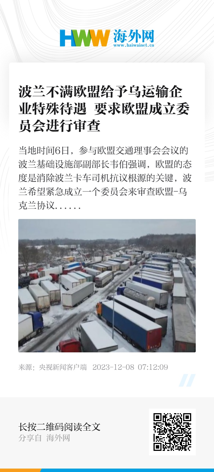 俄乌冲突爆发后,为缓解乌克兰商品的进出口运输压力,欧盟免除了乌运输企业入境欧盟的许可证一年,随后又延长至2024年6月,同时还放宽了其他相关的监管限制。为抗议欧盟给予乌克兰运输企业的特殊待遇,数百名波兰卡车司机11月初开始在波乌边境举行抗议活动,导致大量卡车在两国边境口岸通行受阻。据抗议者说,目前波乌跨国公路运输95%的市场份额已被乌克兰企业占据,大量波兰运输公司破产、司机失业。