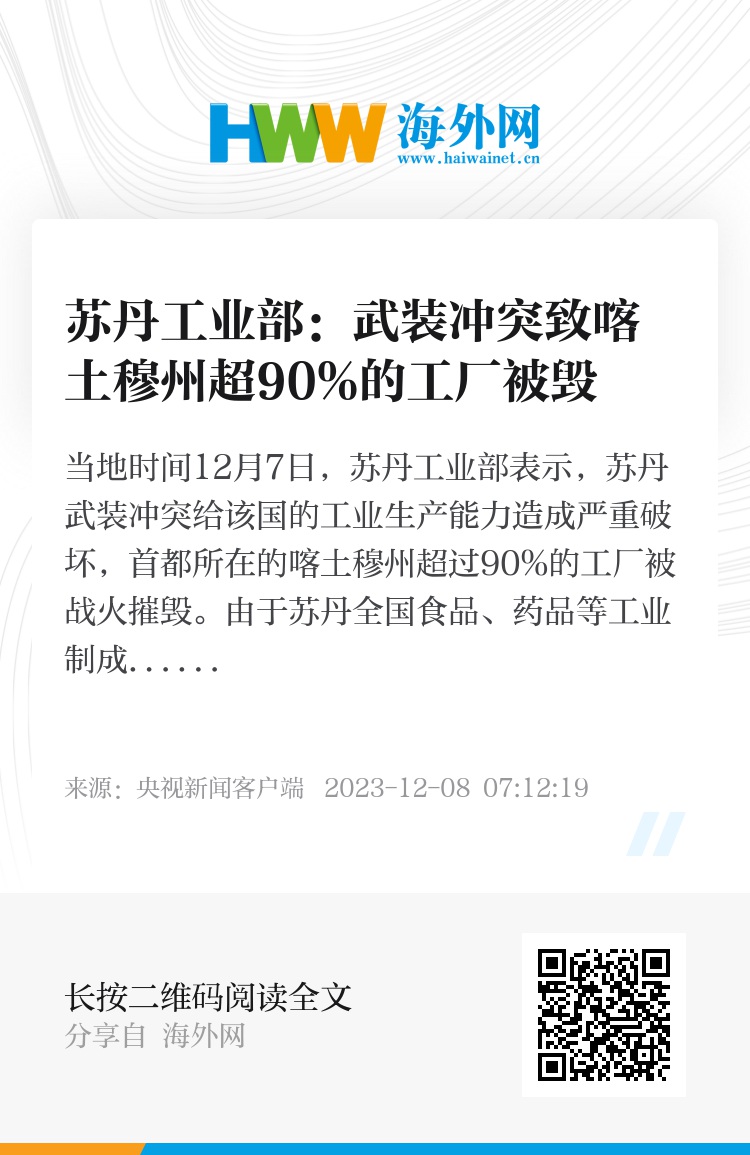 当地时间12月7日,苏丹工业部表示,苏丹武装冲突给该国的工业生产能力造成严重破坏,首都所在的喀土穆州超过90%的工厂被战火摧毁。由于苏丹全国食品、药品等工业制成品的大部分生产能力都集中在喀土穆州,导致当前苏丹很多商品产能不足,供应短缺。