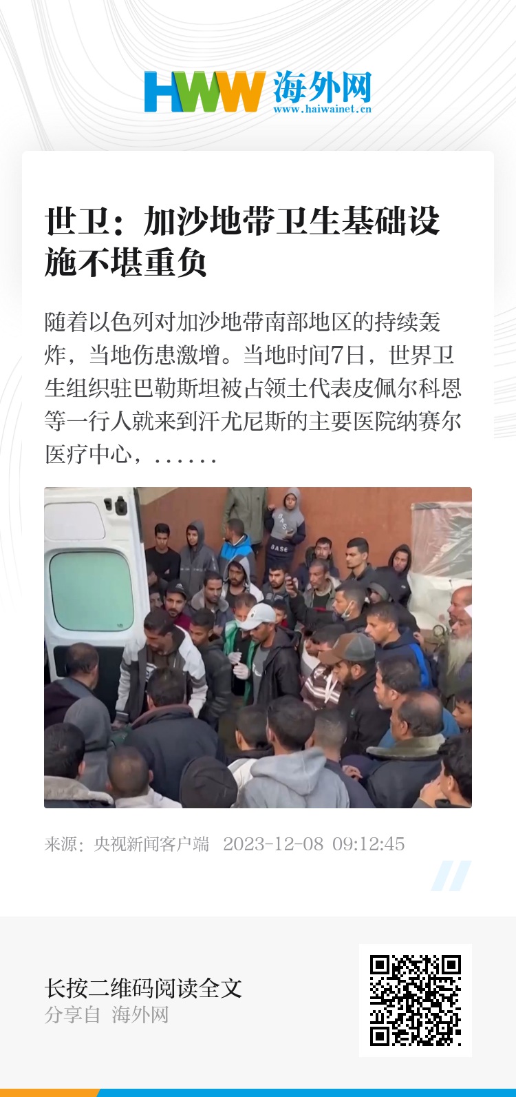 世界卫生组织驻巴勒斯坦被占领土代表 皮佩尔科恩:我们刚刚去了汗尤尼斯纳赛尔医院的急诊室,那里挤满了伤患。我们刚刚得知今天(7日)又有100人受伤,且伤势严重。由于没有床位,我们看到伤者无法在病床上,而是在地板上接受治疗,我们还需要紧急转院救治一些危重伤患。