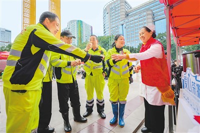 12月4日,在福建省福州市鼓楼区,“爱心茶摊”的志愿者们为环卫工人送上驱寒的姜茶。谢贵明摄(人民图片)