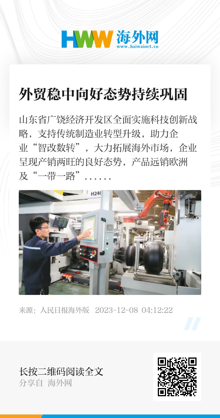 山东省广饶经济开发区全面实施科技创新战略,支持传统制造业转型升级,助力企业“智改数转”,大力拓展海外市场,企业呈现产销两旺的良好态势,产品远销欧洲及“一带一路”共建国家。图为12月6日,工人在广饶经济开发区赛轮(东营)轮胎股份有限公司车间赶制出口订单产品。刘智峰摄(人民视觉)