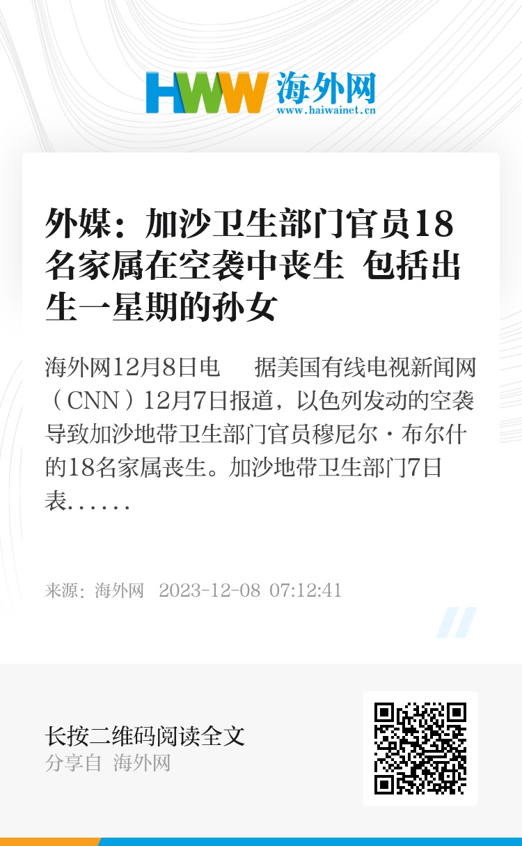 海外网12月8日电 据美国有线电视新闻网(CNN)12月7日报道,以色列发动的空袭导致加沙地带卫生部门官员穆尼尔·布尔什的18名家属丧生。