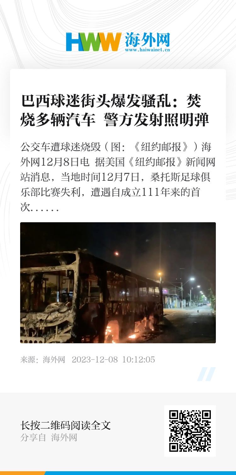 海外网12月8日电 据美国《纽约邮报》新闻网站消息,当地时间12月7日,桑托斯足球俱乐部比赛失利,遭遇自成立111年来的首次降级。巴西街头爆发骚乱,球迷焚烧车辆。