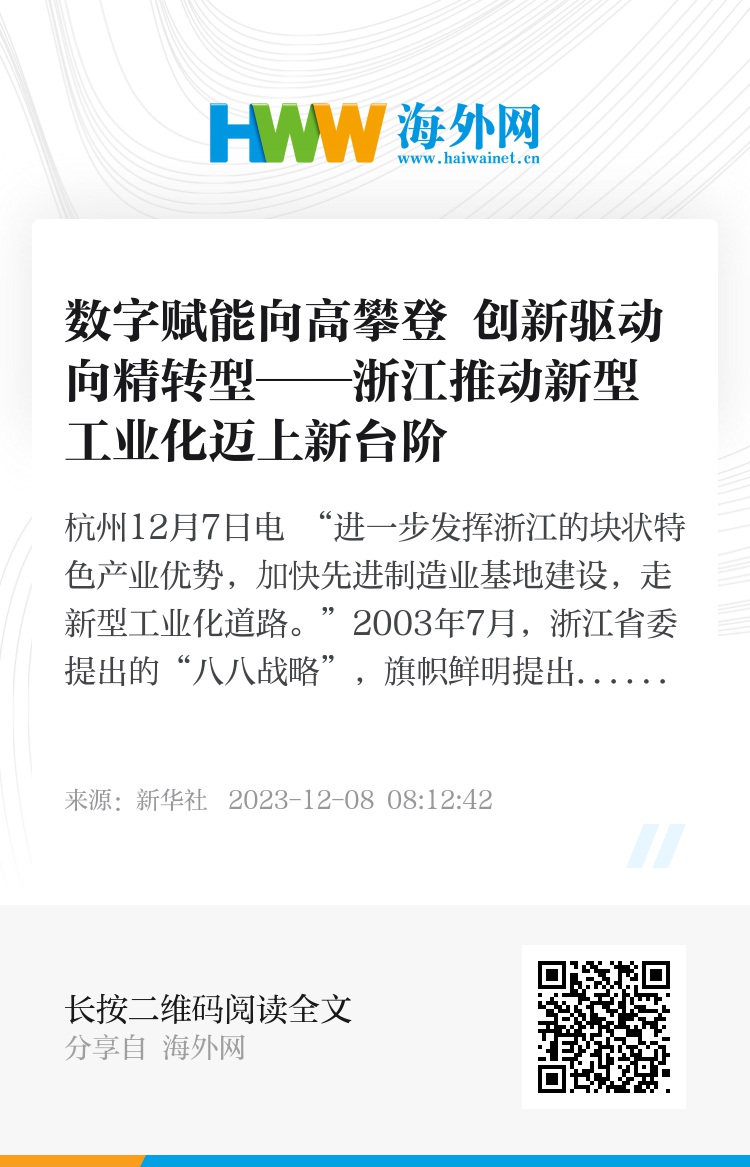 新华社杭州12月7日电 “进一步发挥浙江的块状特色产业优势,加快先进制造业基地建设,走新型工业化道路。”2003年7月,浙江省委提出的“八八战略”,旗帜鲜明提出“新型工业化”。20年来,浙江坚定不移按照“八八战略”的指引,用科技创新凝聚起高质量发展的澎湃动能,奋力推动新型工业化迈上新台阶。