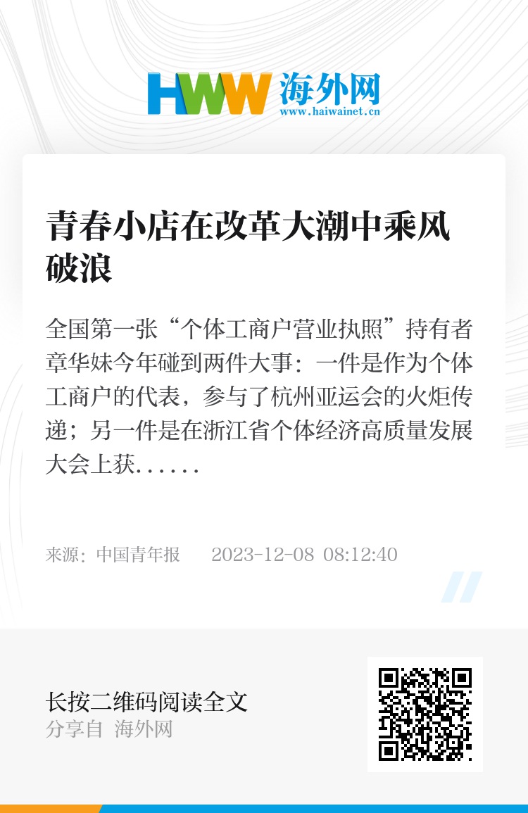全国第一张“个体工商户营业执照”持有者章华妹今年碰到两件大事:一件是作为个体工商户的代表,参与了杭州亚运会的火炬传递;另一件是在浙江省个体经济高质量发展大会上获评“最美个体劳动者”,这也是浙江首次单独为个体工商户召开全省性大会,会议释放了更加支持个体经济发展的信号。
