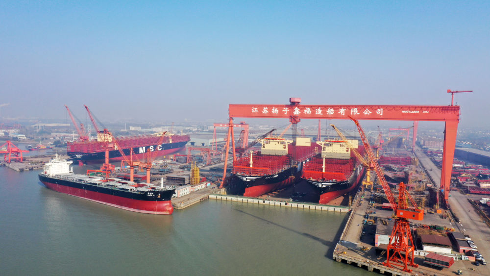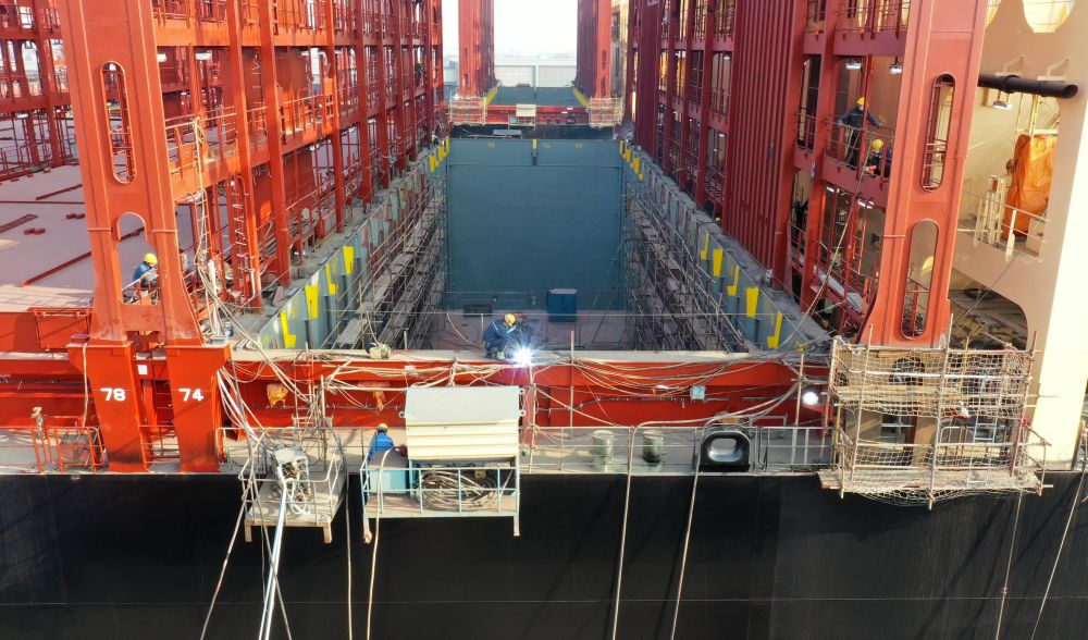 12月5日,在江苏扬子鑫福造船有限公司,工人在一艘集装箱船上作业。