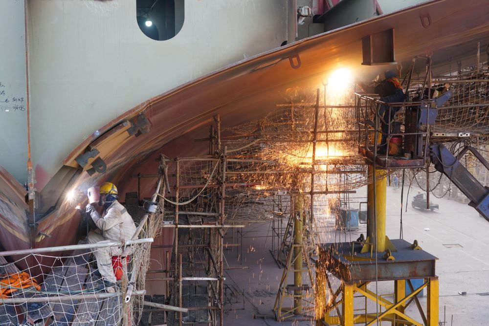 12月5日,在江苏扬子鑫福造船有限公司,工人在加工车间进行焊接作业。