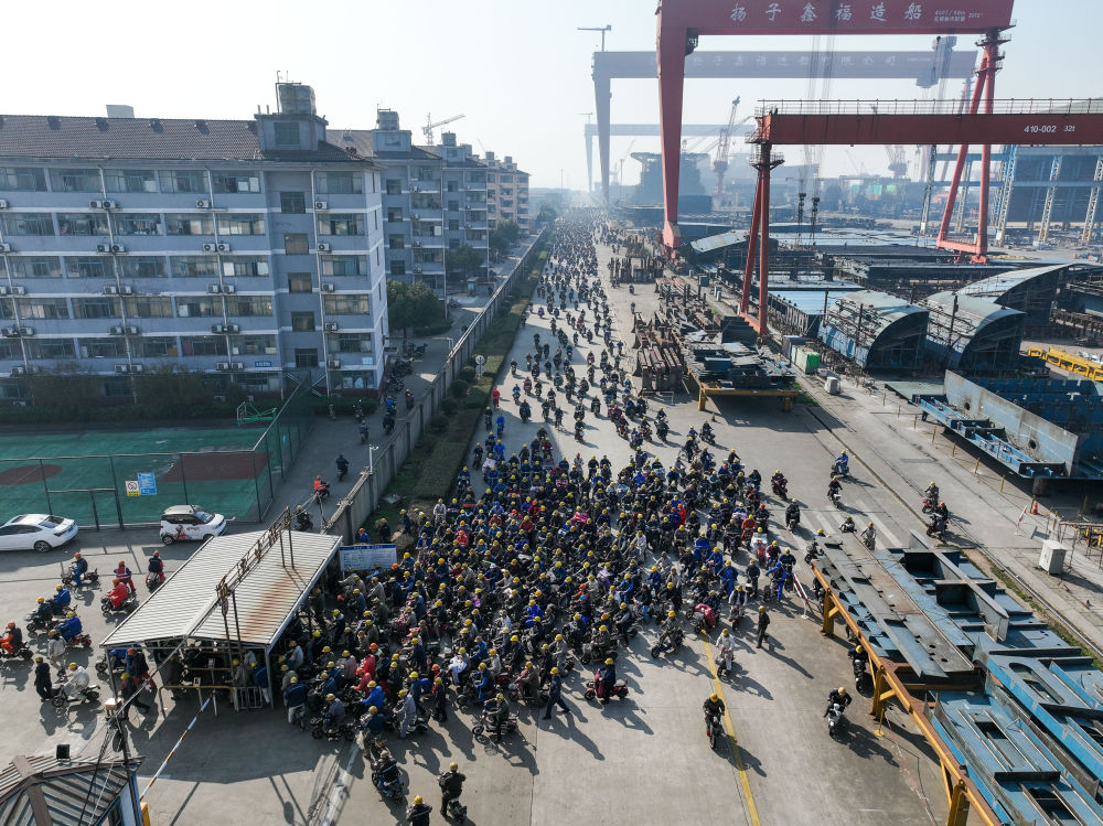 12月5日,在江苏扬子鑫福造船有限公司,工人在中午下班时骑车离开厂区。