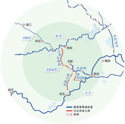 自1951年安徽向国家递交《查勘沟通江淮水道工程报告》至今,江淮儿女已为之奋斗了半个多世纪。如今,千帆竞发、舳舻千里,新航道已过闸通行船舶超1万艘次,货运总吨位超过2000万吨。