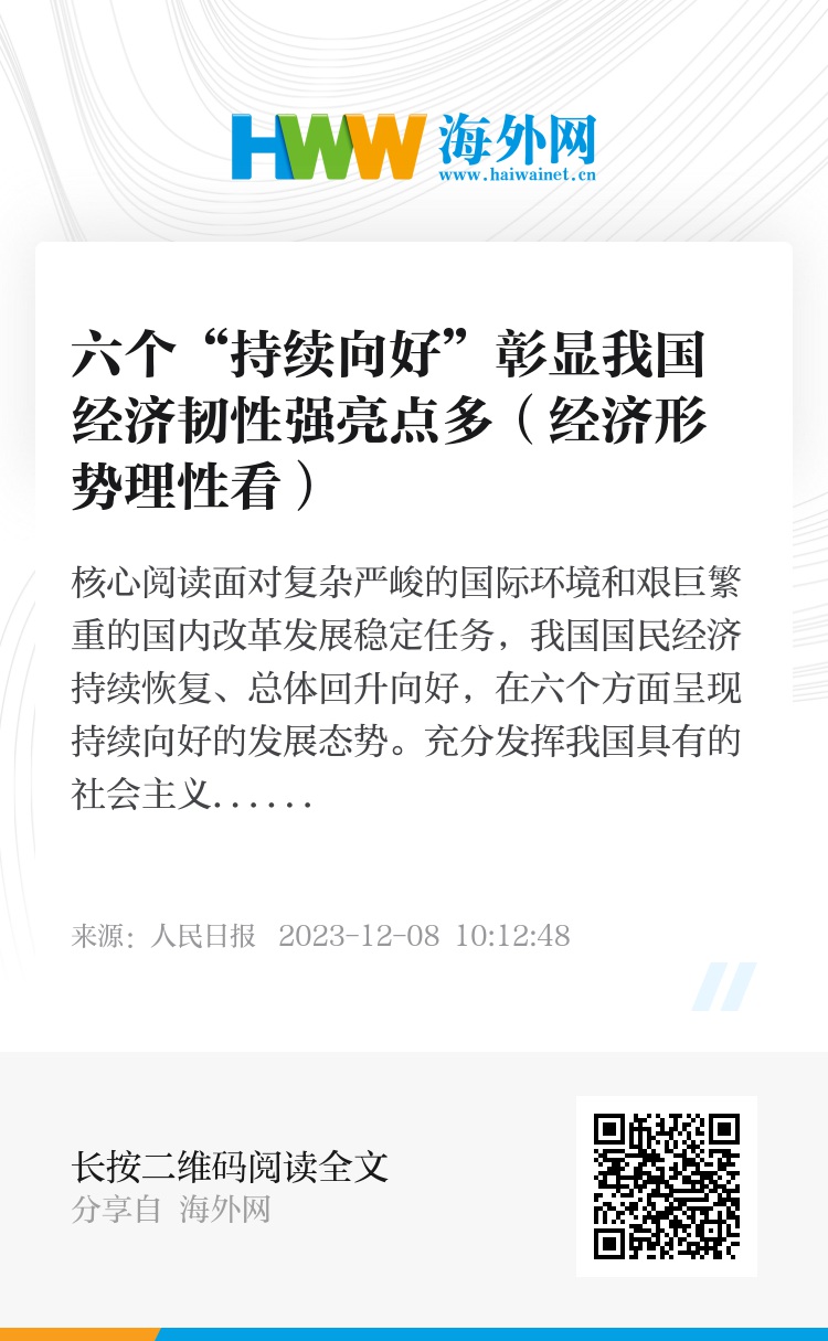 面对复杂严峻的国际环境和艰巨繁重的国内改革发展稳定任务,我国国民经济持续恢复、总体回升向好,在六个方面呈现持续向好的发展态势。充分发挥我国具有的社会主义市场经济的体制优势、超大规模市场的需求优势、产业体系配套完整的供给优势、大量高素质劳动者和企业家的人才优势,扎实推进高质量发展,不断增强自身发展韧性和活力,我国完全有条件有能力战胜困难挑战,推动经济持续健康发展。