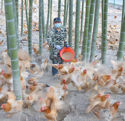 安吉县利用良好生态优势发展林下养殖。图为农户正给竹林鸡喂食。