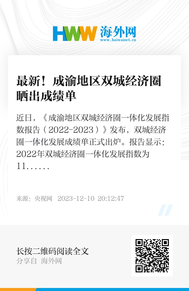近日,《成渝地区双城经济圈一体化发展指数报告(2022-2023)》发布,双城经济圈一体化发展成绩单正式出炉。