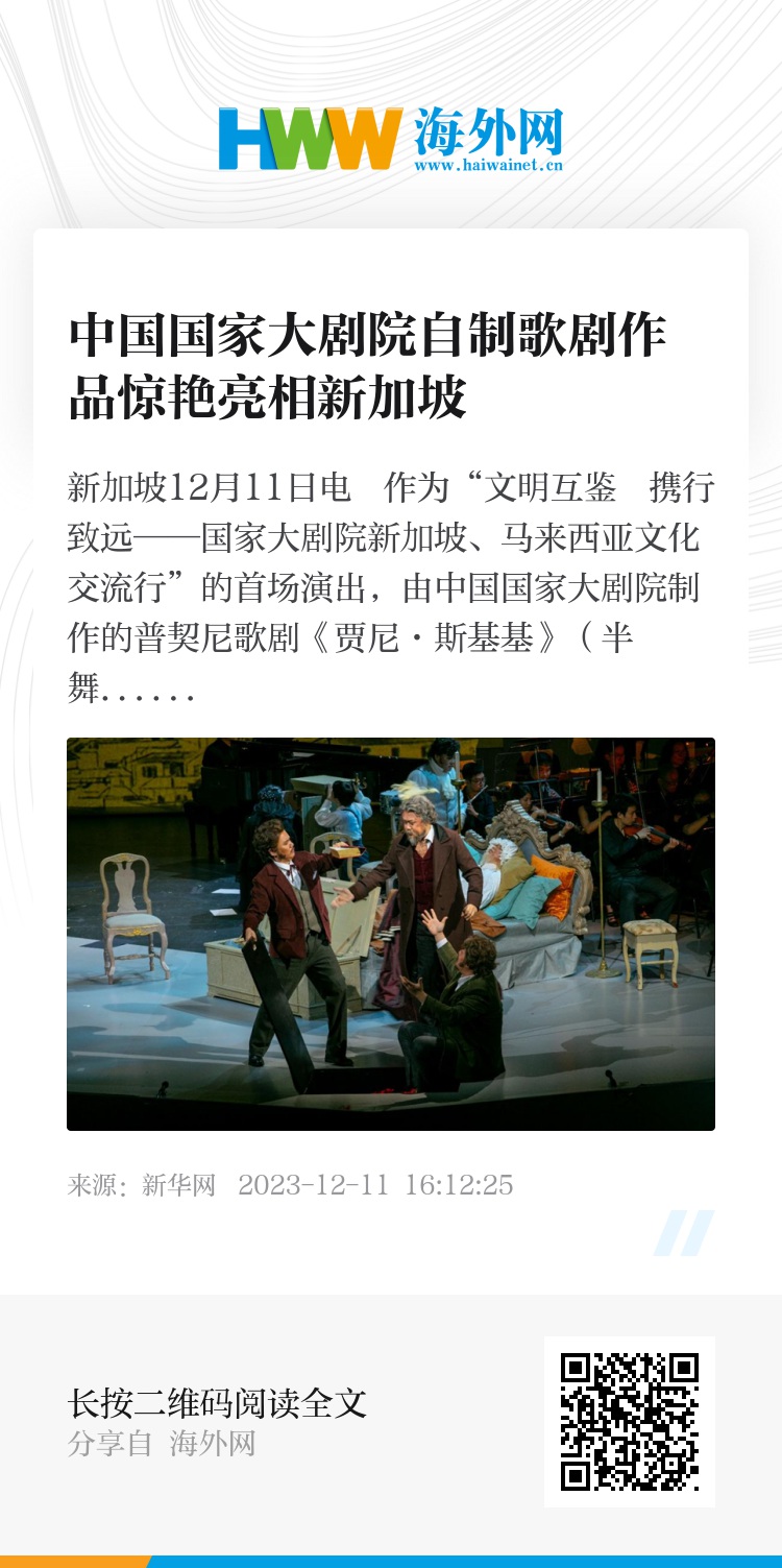 新华网新加坡12月11日电 作为“文明互鉴 携行致远——国家大剧院新加坡、马来西亚文化交流行”的首场演出,由中国国家大剧院制作的普契尼歌剧《贾尼·斯基基》(半舞台版)近日惊艳亮相新加坡滨海艺术中心新电信水滨剧院。