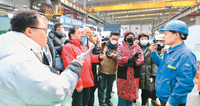 图为采访团一行在沈鼓集团生产车间采访全国五一劳动奖章获得者马长好(右一)。魏炯才摄