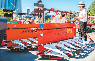 参观者在第三十三届内蒙古国际农业博览会上了解多用割晒机。丁根厚摄