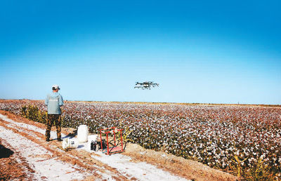 新疆三和植保公司飞手在棉花田操作无人机喷洒脱叶剂。受访企业供图