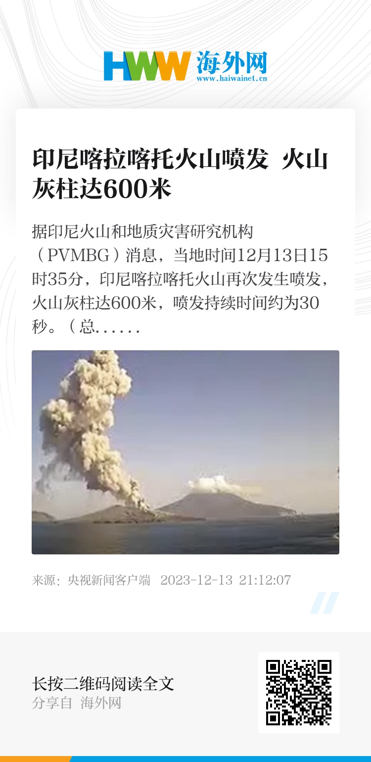 据印尼火山和地质灾害研究机构(PVMBG)消息,当地时间12月13日15时35分,印尼喀拉喀托火山再次发生喷发,火山灰柱达600米,喷发持续时间约为30秒。(总台记者 石玥)