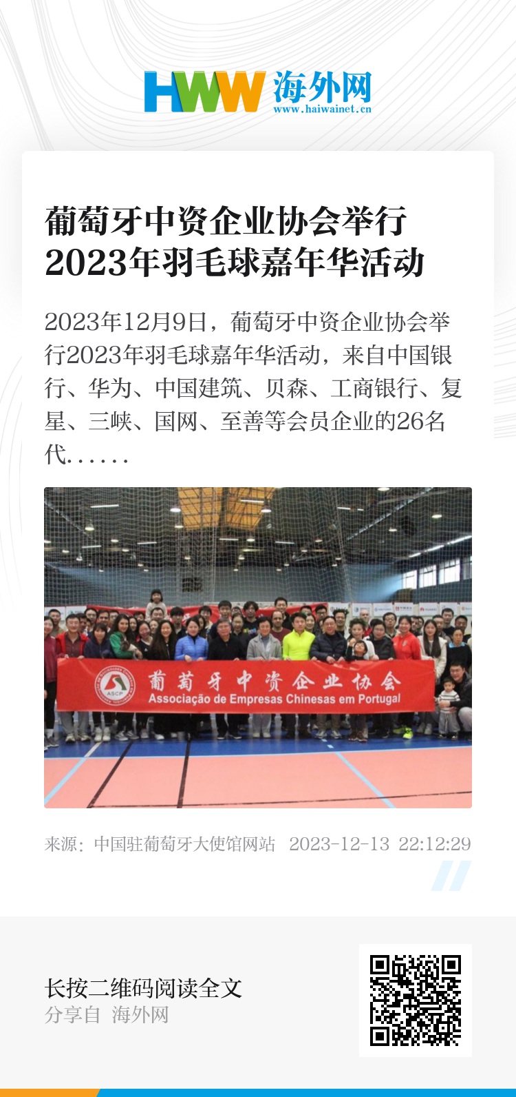2023年12月9日,葡萄牙中资企业协会举行2023年羽毛球嘉年华活动,来自中国银行、华为、中国建筑、贝森、工商银行、复星、三峡、国网、至善等会员企业的26名代表参赛。驻葡萄牙大使赵本堂、主管经济商务事务参赞夏晓玲和中企协会长肖亮等出席并为获奖集体和个人颁奖。