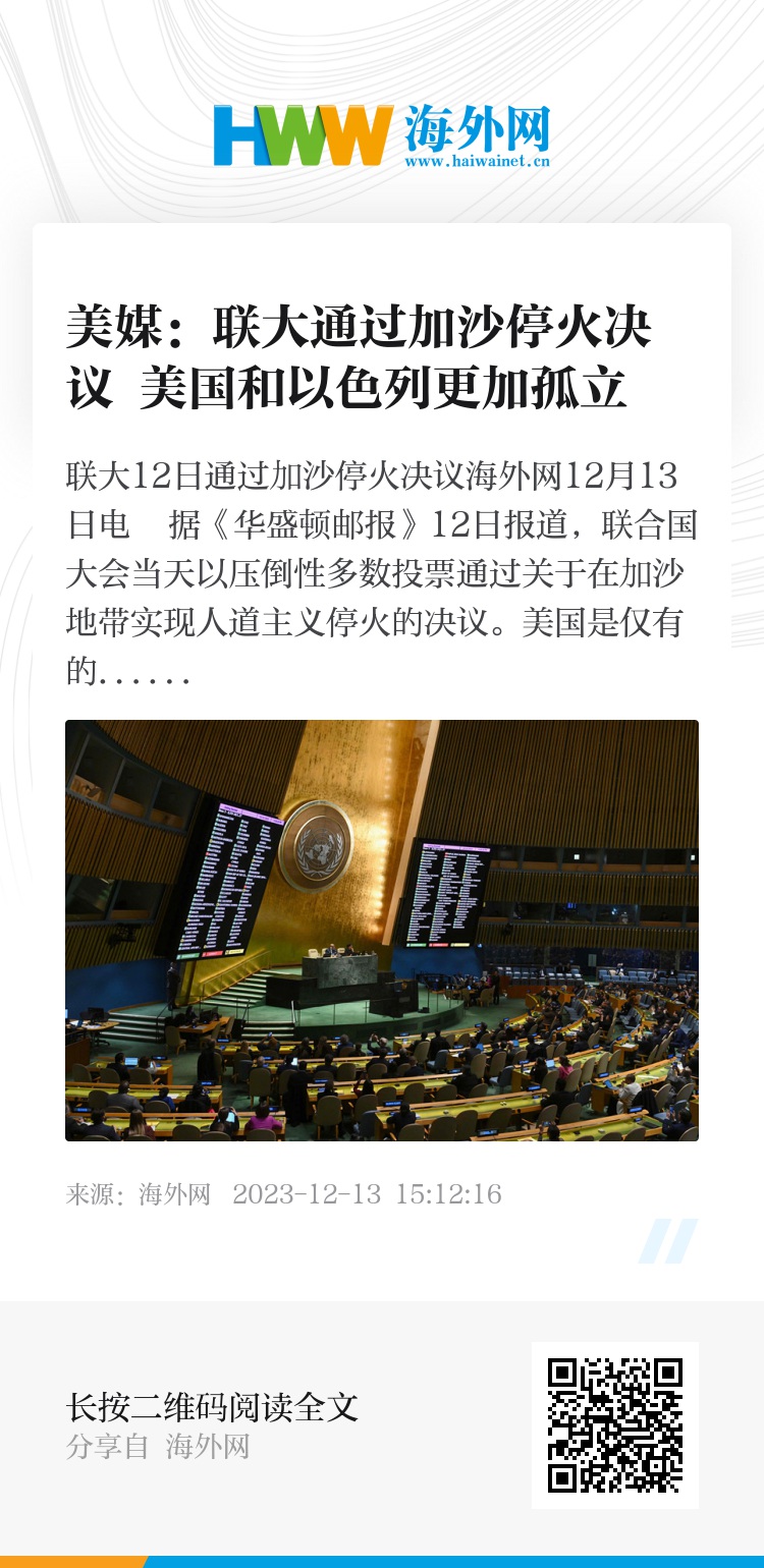 海外网12月13日电 据《华盛顿邮报》12日报道,联合国大会当天以压倒性多数投票通过关于在加沙地带实现人道主义停火的决议。美国是仅有的10个投下反对票的国家之一。多个美国盟友改变立场,使得美国和以色列发现自己越来越孤立。