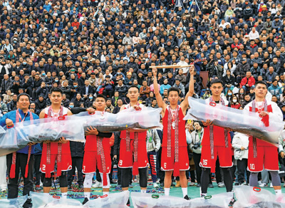 参赛球队在“村BA”颁奖仪式上领取奖品养殖鲟鱼。本文配图均由新华社发