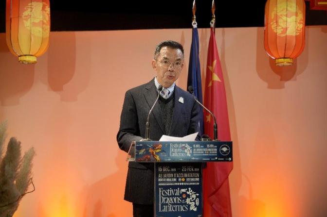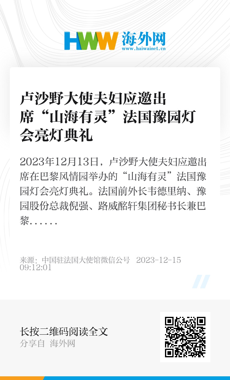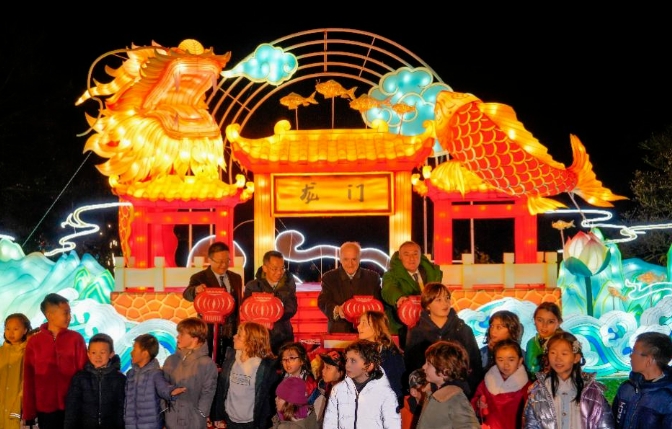 2023年12月13日,卢沙野大使夫妇应邀出席在巴黎风情园举办的“山海有灵”法国豫园灯会亮灯典礼。法国前外长韦德里纳、豫园股份总裁倪强、路威酩轩集团秘书长兼巴黎风情园园长贾梅共同出席活动。