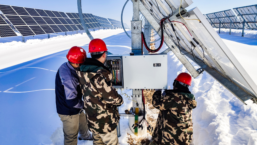 华能聚宝光伏电站巡检人员在对光伏组件进行检修,确保设备安全稳定运行。翁雪尘摄