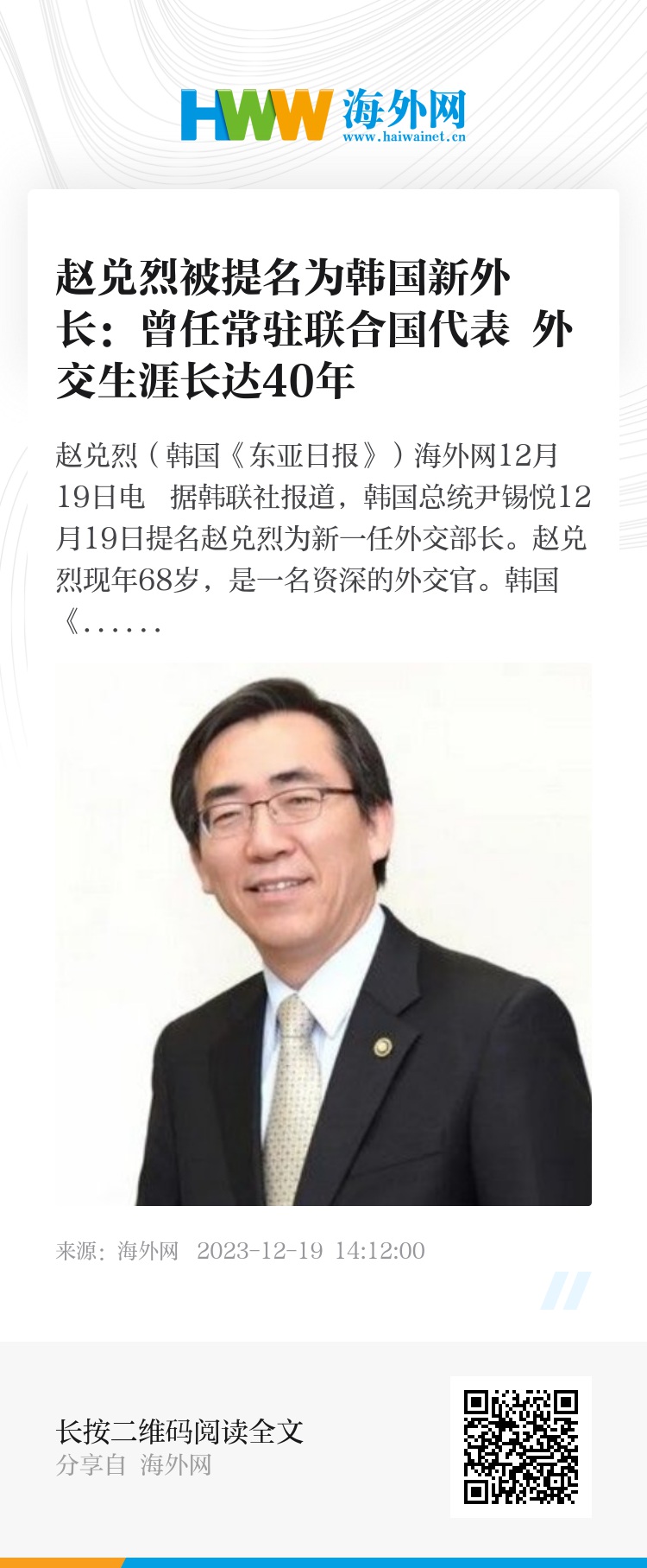海外网12月19日电 据韩联社报道,韩国总统尹锡悦12月19日提名赵兑烈为新一任外交部长。