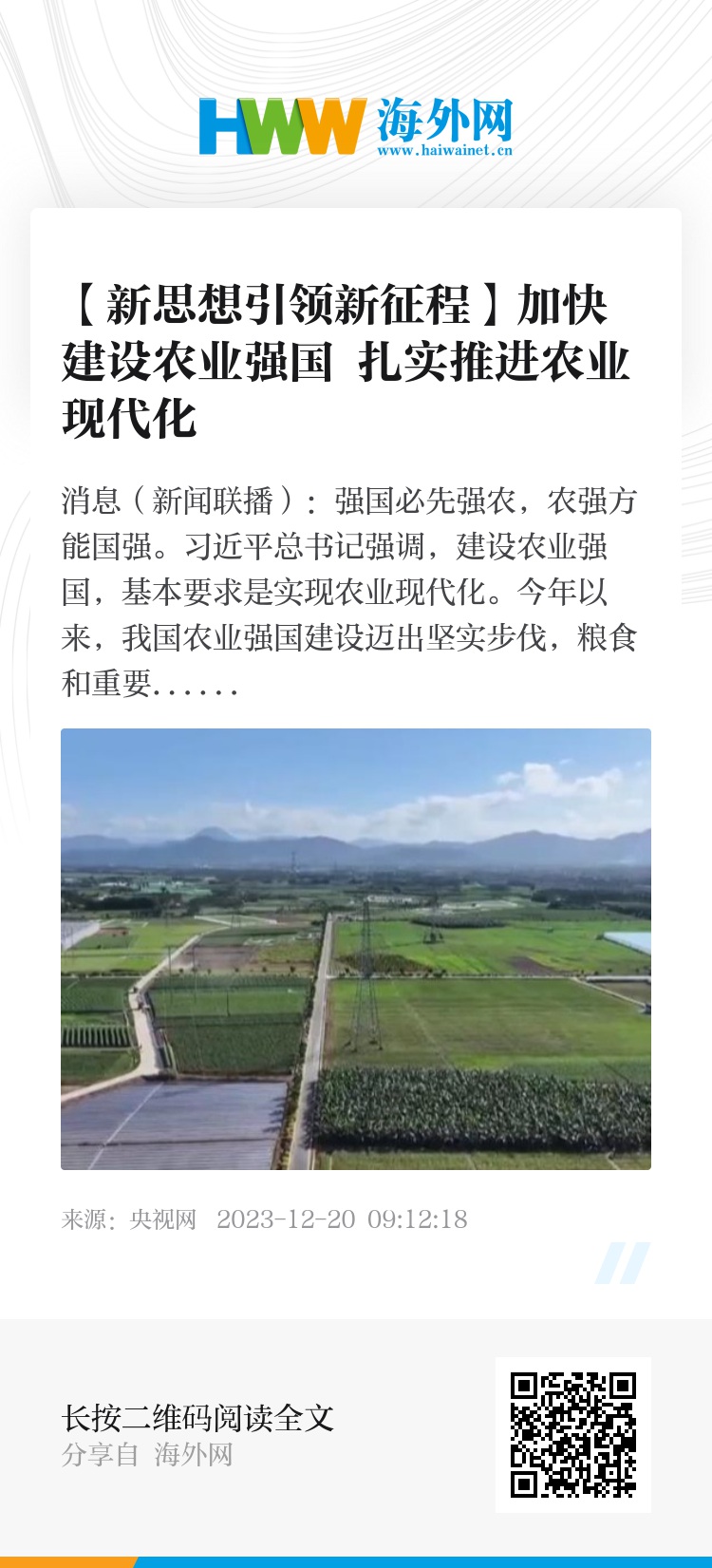 央视网消息(新闻联播):强国必先强农,农强方能国强。习近平总书记强调,建设农业强国,基本要求是实现农业现代化。