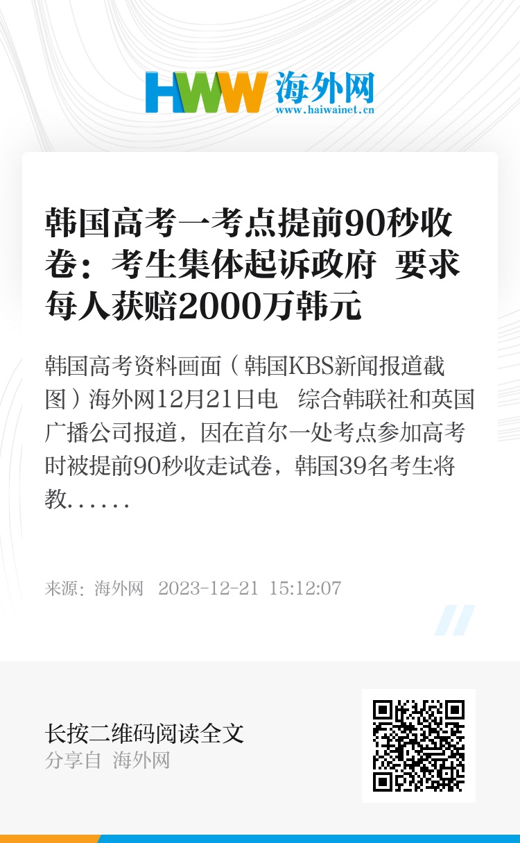 海外网12月21日电 综合韩联社和英国广播公司报道,因在首尔一处考点参加高考时被提前90秒收走试卷,韩国39名考生将教育部门告上法庭,要求每人获赔2000万韩元(约11万元人民币),这也是他们复读一年所需的费用。