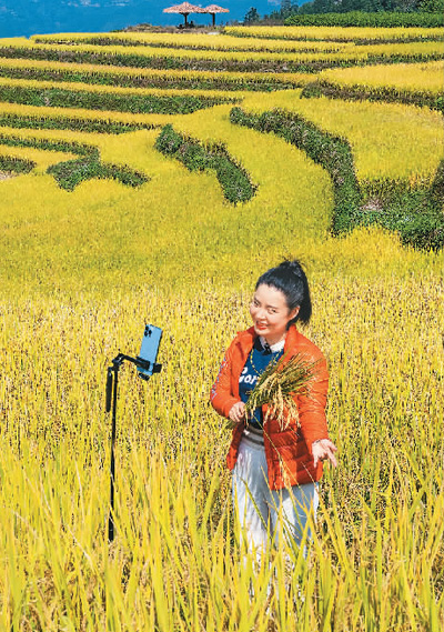 一名电商主播在湖北省宜昌市秭归县沙镇溪镇长春村高山冷水稻基地进行直播带货。郑家裕摄(人民视觉)