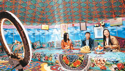 新疆维吾尔自治区昌吉市一名农牧民(中)在直播卖货。梁宏涛摄(人民视觉)