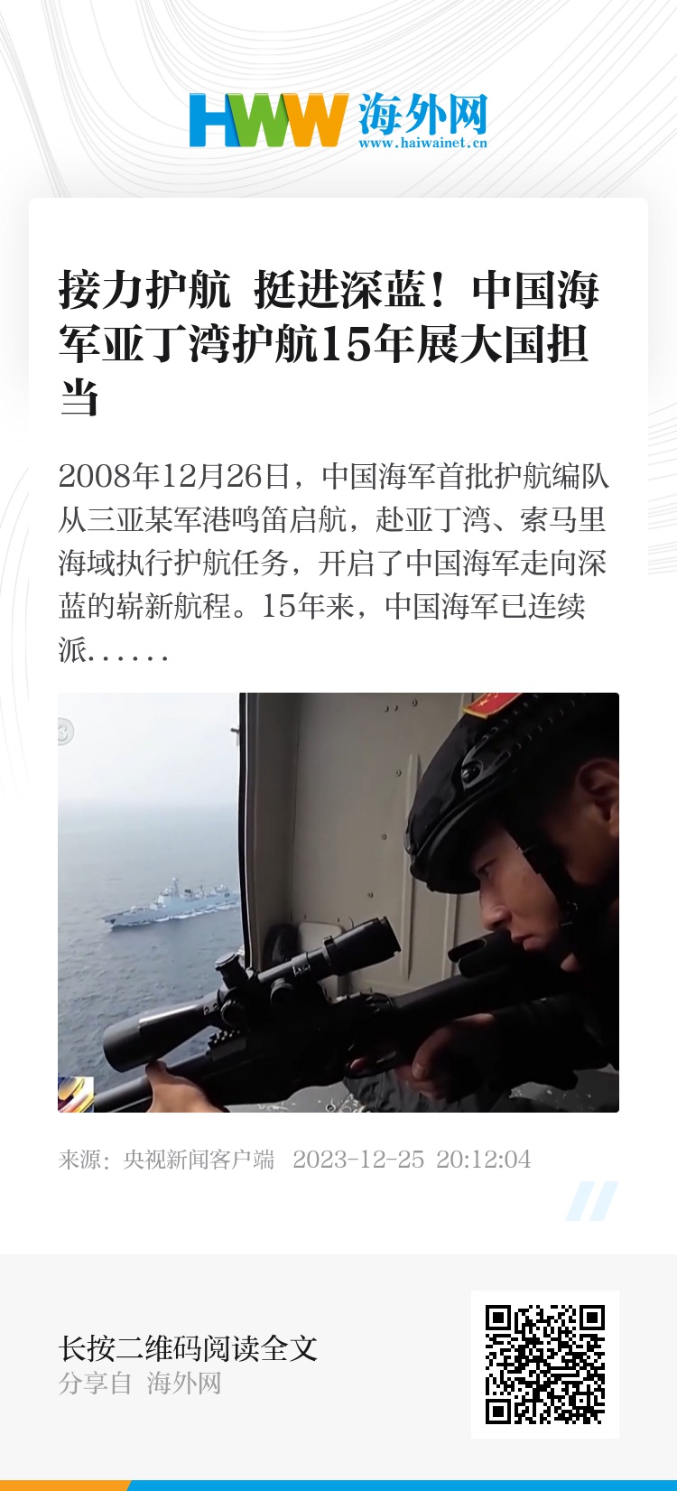 从2008年12月起,中国海军远赴万里之外的亚丁湾执行护航任务,至今已经整整15年。15年来,中国海军护航编队使命任务不断拓展,从最初的为中国船舶护航,发展到为其他国家船舶护航,以实际行动践行了人类命运共同体、海洋命运共同体理念,展现了中国负责任大国的担当。