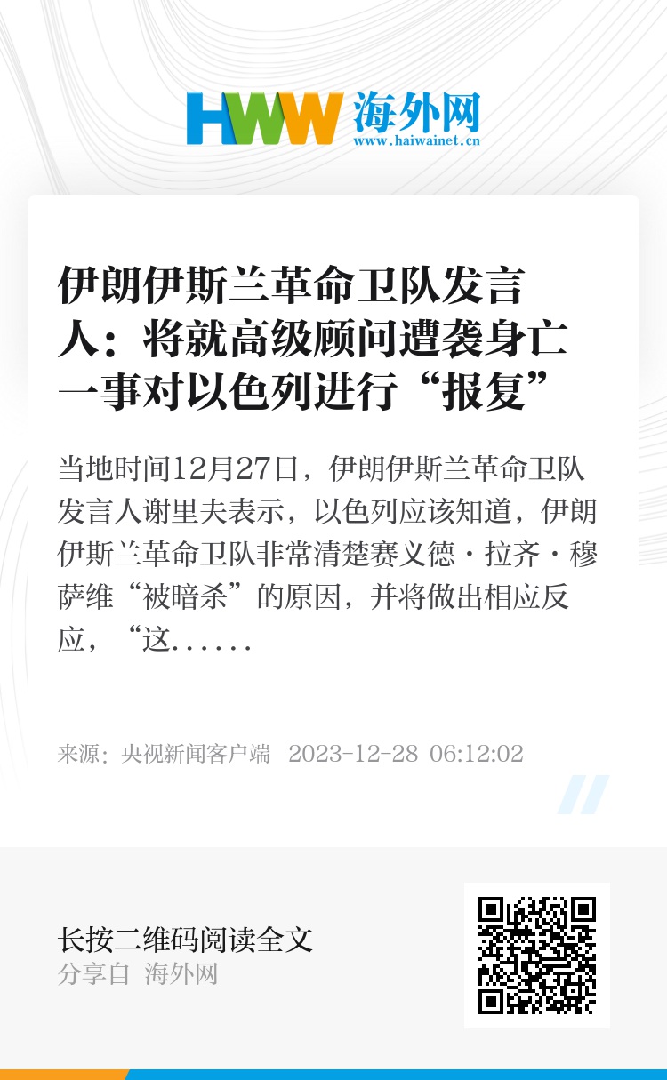 当地时间12月27日,伊朗伊斯兰革命卫队发言人谢里夫表示,以色列应该知道,伊朗伊斯兰革命卫队非常清楚赛义德·拉齐·穆萨维“被暗杀”的原因,并将做出相应反应,“这些报复将会在不同的时间和地点继续进行。”
