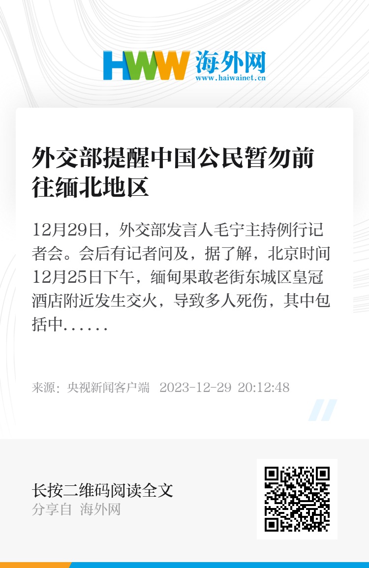 当前,缅甸果敢自治区安全形势严峻复杂。外交部提醒中国公民暂勿前往缅北地区,呼吁在当地中国公民切实做好安全防范。