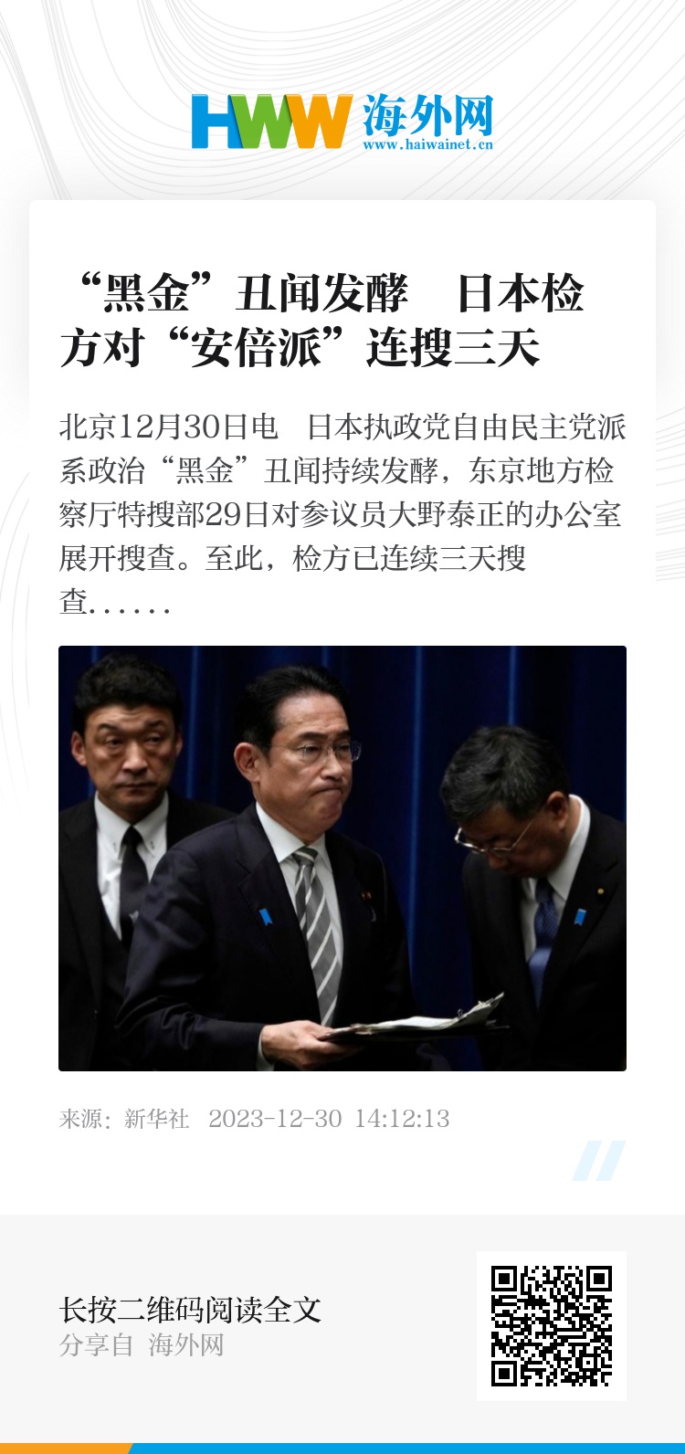 新华社北京12月30日电 日本执政党自由民主党派系政治“黑金”丑闻持续发酵,东京地方检察厅特搜部29日对参议员大野泰正的办公室展开搜查。至此,检方已连续三天搜查“安倍派”成员的住所和办公室。