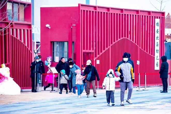 雄安北海幼儿园位于雄安新区启动区,是北京市以“交钥匙”方式援建河北雄安新区“三校一院”项目之一。校园整体造型融入了北海元素,延续了“红墙绿树白塔边”的建筑风格。图为雄安北海幼儿园放学场景。人民视觉