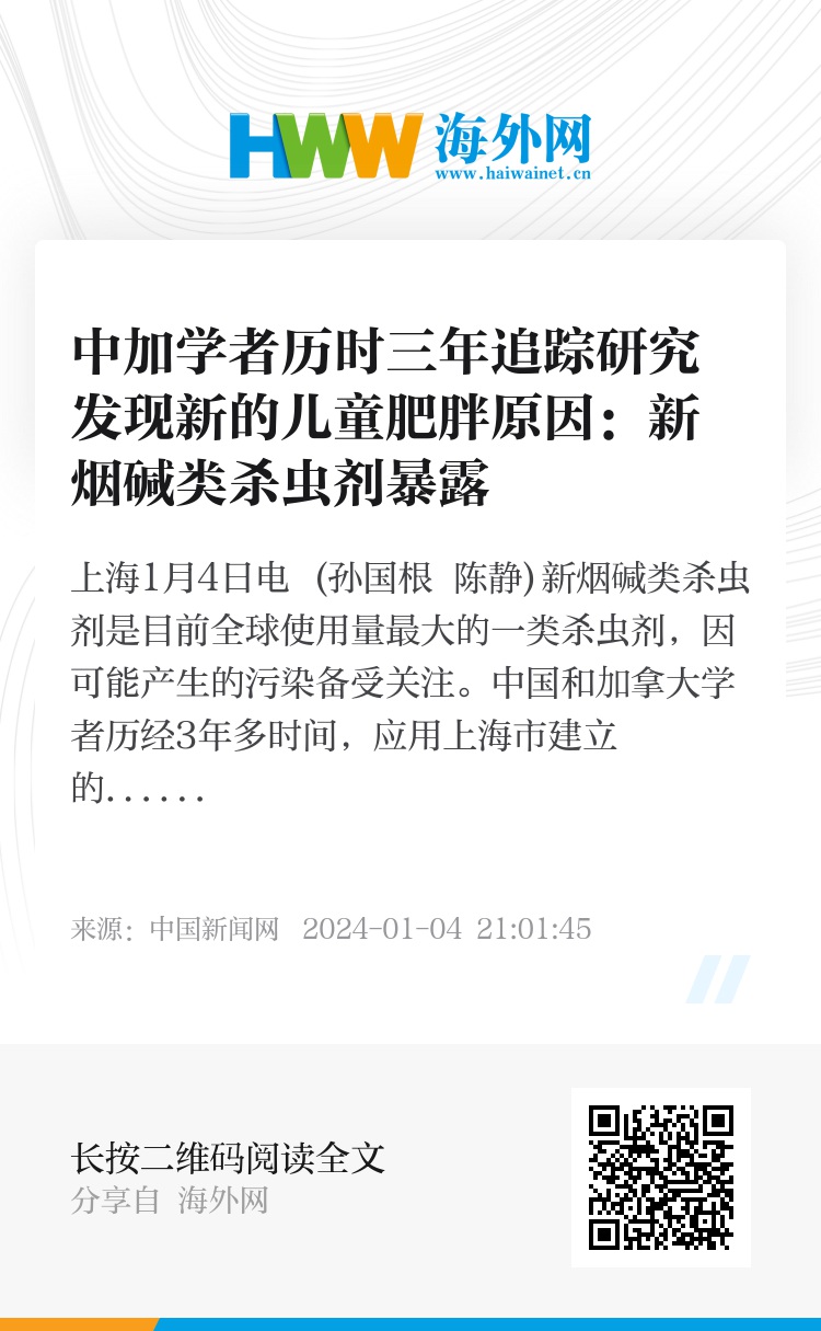 中国和加拿大学者历经3年多时间,应用上海市建立的儿童健康动态队列,调查上海市学龄儿童新烟碱类杀虫剂的暴露情况及与儿童肥胖的关系。研究人员检测后发现,孩子们的尿液中有8种新烟碱类杀虫剂和4种代谢产物,且新烟碱类杀虫剂暴露是儿童肥胖的潜在危险因素。