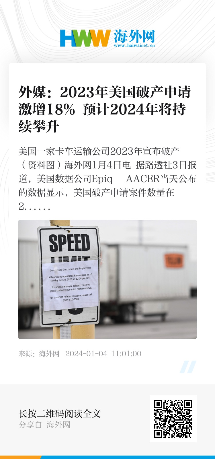 海外网1月4日电 据路透社3日报道,美国数据公司Epiq AACER当天公布的数据显示,美国破产申请案件数量在2023年同比激增18%,反映出利率升高、贷款条件更严、政府撤销刺激经济措施等因素给美国经济带来冲击。