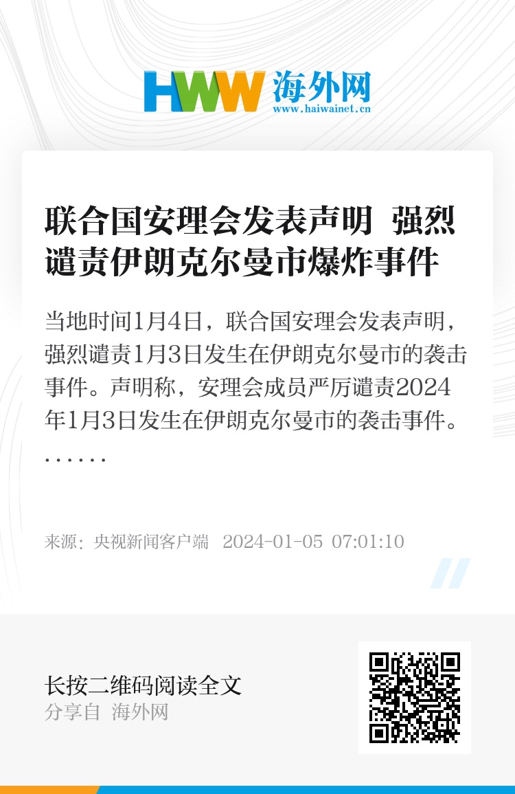 当地时间1月4日,联合国安理会发表声明,强烈谴责1月3日发生在伊朗克尔曼市的袭击事件。