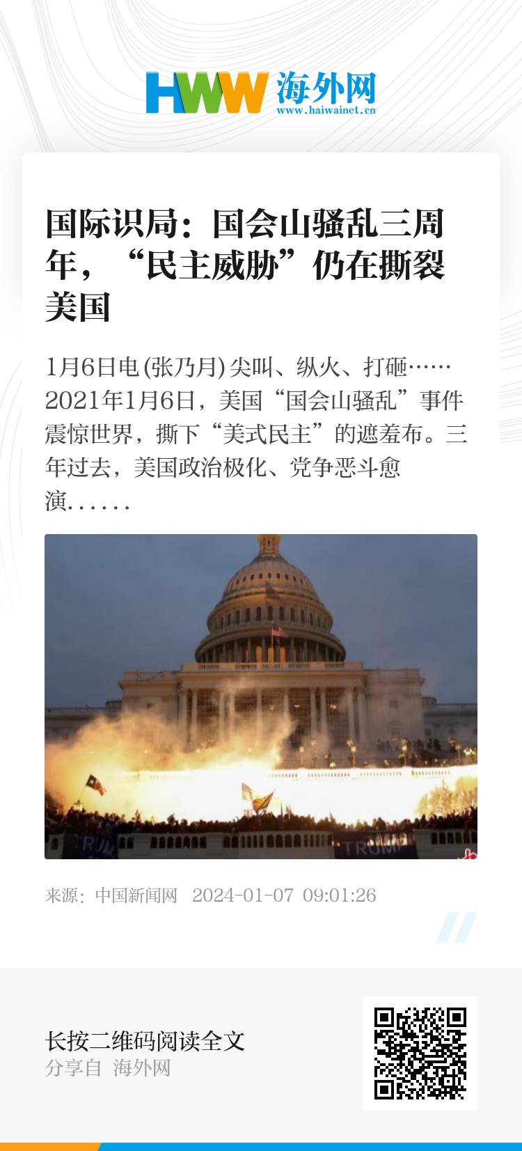 三年过去,美国政治极化、党争恶斗愈演愈烈。随着2024年总统大选即将到来,对于国会山骚乱“如何发生、谁该负责、影响几何”的争议进一步加剧了两党分歧,令美国面临更多的混乱和动荡。
