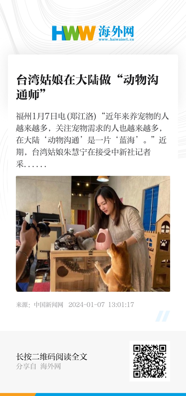 中新网福州1月7日电(郑江洛)“近年来养宠物的人越来越多,关注宠物需求的人也越来越多,在大陆‘动物沟通’是一片‘蓝海’。”近期,台湾姑娘朱慧宁在接受中新社记者采访时表示。