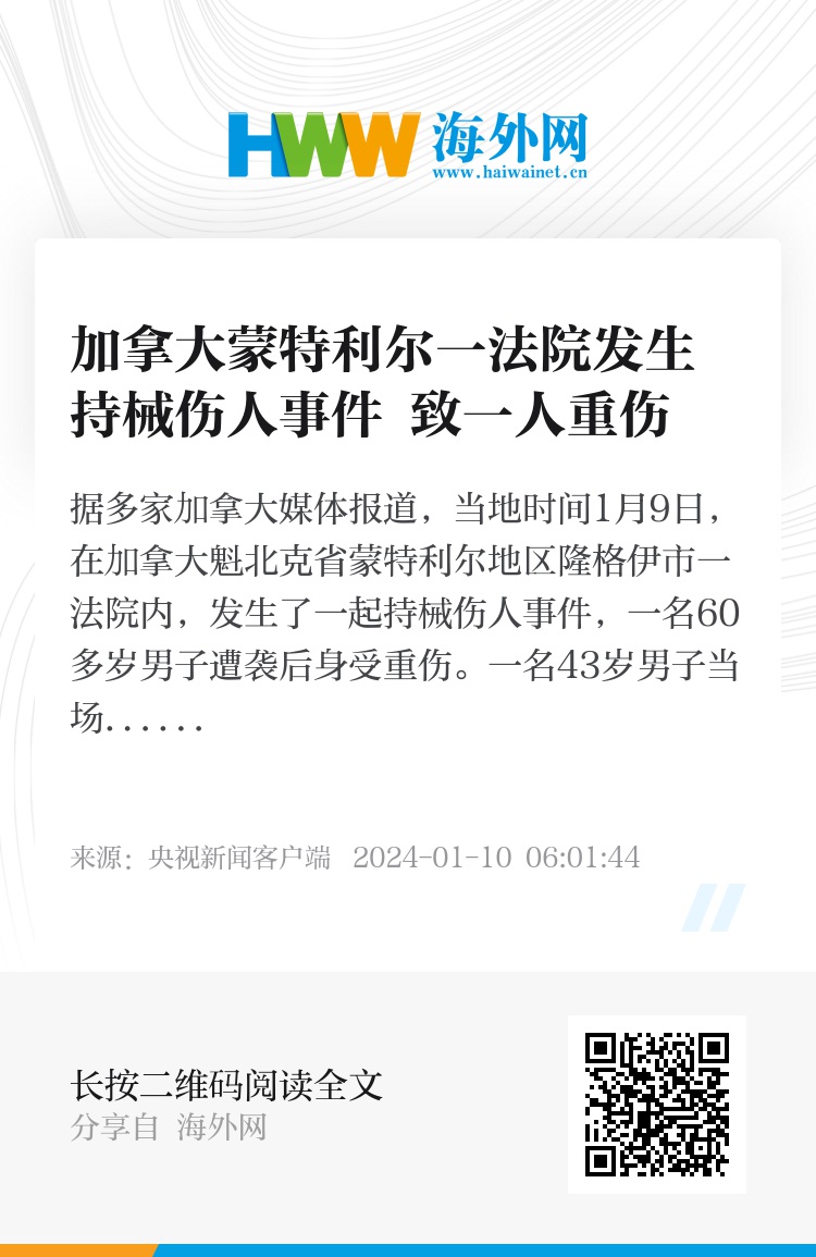 据多家加拿大媒体报道,当地时间1月9日,在加拿大魁北克省蒙特利尔地区隆格伊市一法院内,发生了一起持械伤人事件,一名60多岁男子遭袭后身受重伤。一名43岁男子当场被捕,警方称其可能面临谋杀未遂的指控。