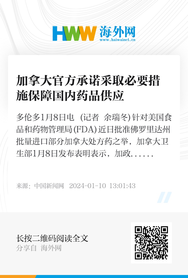 中新网多伦多1月8日电 (记者 余瑞冬)针对美国食品和药物管理局(FDA)近日批准佛罗里达州批量进口部分加拿大处方药之举,加拿大卫生部1月8日发布表明表示,加政府正在采取一切必要措施保障加拿大国内药品供应,并确保加拿大人能够获得所需的处方药。