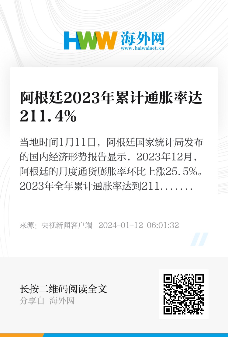 当地时间1月11日,阿根廷国家统计局发布的国内经济形势报告显示,2023年12月,阿根廷的月度通货膨胀率环比上涨25.5%。2023年全年累计通胀率达到211.4%。