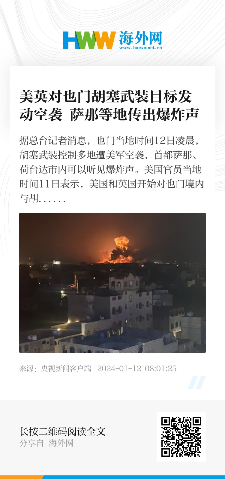 据总台记者消息,也门当地时间12日凌晨,胡塞武装控制多地遭美军空袭,首都萨那、荷台达市内可以听见爆炸声。