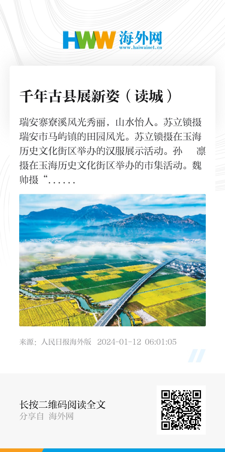 近900年过去,飞云江的水依然滔滔不绝,向东奔流入海。飞云江畔的瑞安展现着传统与现代交织、古老与时尚融合的时代活力。它不仅是一座历史文化名城,也是浙江重要的现代工贸城市、温州大都市区南翼中心城市,还是我国民营经济的先发地区、温州模式的重要发祥地之一。